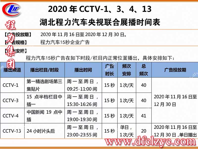 今天程力集團(tuán)小編特別興奮,因?yàn)槲覀?a href="http://www.solar-magic.com" target="_blank">湖北程力上央視推廣了,這代表著程力集團(tuán)高質(zhì)量發(fā)展引領(lǐng)專汽暨應(yīng)急裝備制造行業(yè)風(fēng)向標(biāo),中央電視臺(tái)1、3、4、13臺(tái)新聞聯(lián)播、中國(guó)新聞、中文國(guó)際等欄目聯(lián)合盛大展播,播放表如下,請(qǐng)大家觀看分享。